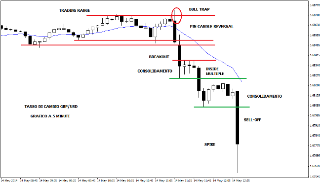 Il grafico in alto riferito al tasso di cambio GBP/USD, time frame a 5 minuti, mostra una classica bull trap sui top intraday messa a punto dai big boys per ingannare i trader retail. Questa trappola degli specialisti si può riconoscere dal falso breakout, accompagnato da una pin candle reversal. Uno swing del genere è un netto segnale short, utilizzabile dallo scalper o dal day-trader per mettere a punto una transazione molto vantaggiosa sotto il profilo del rapporto rischio/rendimento.