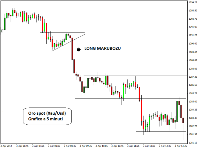 Nella candlestick analysis queste candele vengono identificate come la massima espressione della forza o della debolezza del mercato in un preciso momento. In genere sono candele che segnalano la possibilità di un’accelerazione di prezzi nella stessa direzione del trend, indicato dalla chiusura della marubozu. La loro affidabilità statistica è molto elevata. Per capire meglio la loro potenzialità si può dare un’occhiata al grafico mostrato in alto sull’oro spot (Xau/Usd), time frame a 5 minuti, che evidenzia un’accelerazione ribassista dei prezzi in grado di offrire una ghiotta opportunità di guadagno in ottica di scalping.