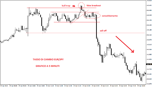 Il grafico in alto sul cross EUR/JPY, ovvero euro su yen giapponese, time frame a 5 minuti, mostra una classica bull trap orchestrata ad arte dai large traders sui massimi di giornata. La fuoriuscita dei prezzi da una fase laterale con una long candle rialzista invita molti trader a comprare, ma nel giro di pochi minuti avviene una rapida inversione che si completa con il sell-off delle quotazioni rappresentato da una lunga candela nera. La bull trap ha ingabbiato molti buyers e a questo punto il crollo dei prezzi viene accentuato dalla frettolosa ricopertura delle posizioni long.