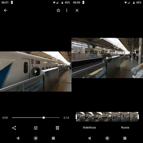 Quando l’operazione viene completata, sotto il filmato compaiono i comandi Stabilizza e Ruota, oltre a due linee verticali all’inizio e alla fine del video. Se vogliamo eliminare la parte iniziale del video, tocchiamo la linea verticale di sinistra e trasciniamola verso destra fino al punto esatto dove vogliamo che parta il filmato. Al contrario, se è nostra intenzione tagliare la parte finale, facciamo tap sulla linea verticale di destra e trasciniamola verso sinistra.