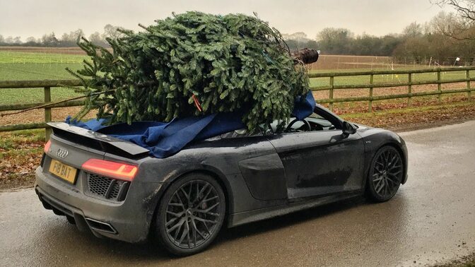 Per guidare in sicurezza bisogna calcolare che con un abete sulla propria auto aumenta il peso complessivo e si alza il baricentro, due variabili importanti per l’equilibrio soprattutto in curva. Bisogna usare cinte non elastiche, in modo che anche in caso di brusche frenate l’albero non cada dall’auto. Praticamente è meglio evitare di trasportare l’abete nelle pessime modalità che vedete nella foto poco sopra, tra l’altro su una Audi R8.