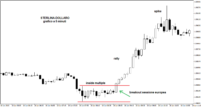 In alto è stato mostrato il grafico a 5 minuti del tasso di cambio GBP/USD, ovvero sterlina/dollaro, sul quale si forma una fase di congestione dei prezzi molto stretta poco prima dell’inizio delle compravendite sui mercati europei. Il pattern formatosi è quello delle inside multiple. Il successivo breakout dà il via a un boom dei prezzi, tale da spingere il Cable da 1,5820 a 1,5930 nel giro di un’ora e mezza.