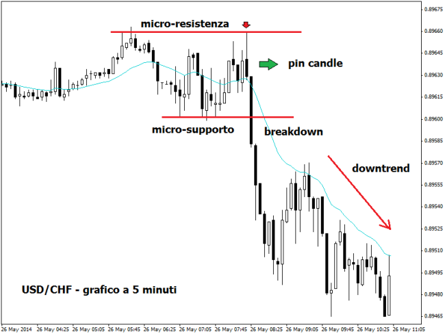 Poi bisogna accertarsi che il segnale sia avvalorato dalla presenza di un fattore di confluenza del prezzo, in genere i livelli di supporto o resistenza più importanti del mercato. Per capire questo scenario ci si può aiutare con il grafico in alto relativo al tasso di cambio USD/CHF, time frame a 5 minuti. La pin candle si forma su una zona di micro-resistenza, sulla parte alta di una fase di consolidamento. Il segnale si attiva appena dopo la comparsa della candela pinocchio. Il rapporto risk/reward è decisamente convincente.