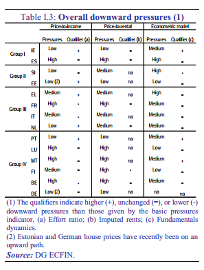 Nel complesso, l’analisi comparativa tra paese e paese che copre le principali dimensioni rilevanti riesce a dare una panoramica degli squilibri del mercato immobiliare e fornisce una prima approssimazione a divergenze esistenti tra i paesi dell’area euro. La tabella qui sotto presenta una panoramica delle pressioni esercitate dal mercato immobiliare come segnalato dai vari metodi.