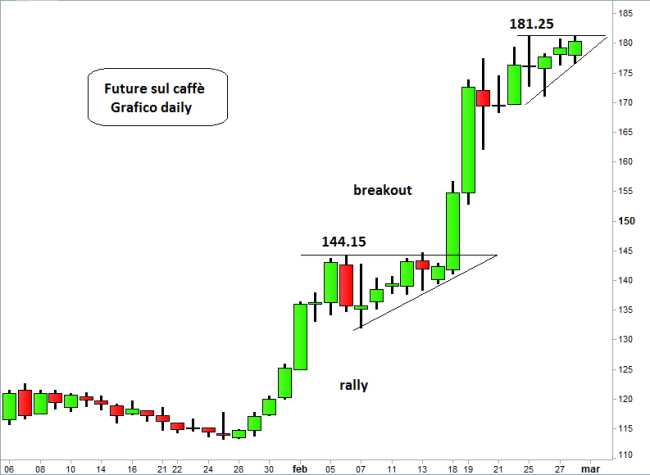 Il future sul gas naturale, che il 10 gennaio scorso era sceso fin sotto 4$, ha iniziato a mettere in mostra un boom spettacolare che ha visto le quotazioni salire fino a 6,49$. Poi i prezzi sono crollati sulle imponenti prese di beneficio degli speculatori long e attualmente sono a 4,6$. In Brasile, invece, la siccità ha fatto schizzare le quotazioni del caffè, che erano depresse da diverso tempo. Il future sul caffè quotato al Cme è balzato del 60% in un mese. Sul finire di novembre i prezzi avevano toccato un bottom “psicologico” a 100$, ma venerdì è stato toccato il massimo più alto da fine ottobre 2012 a 181,25$. Ottimo anche l’andamento dei metalli preziosi, in particolare l’oro che da inizio anno è salito del 10% circa, spingendosi anche fino a 1.345$ l’oncia.