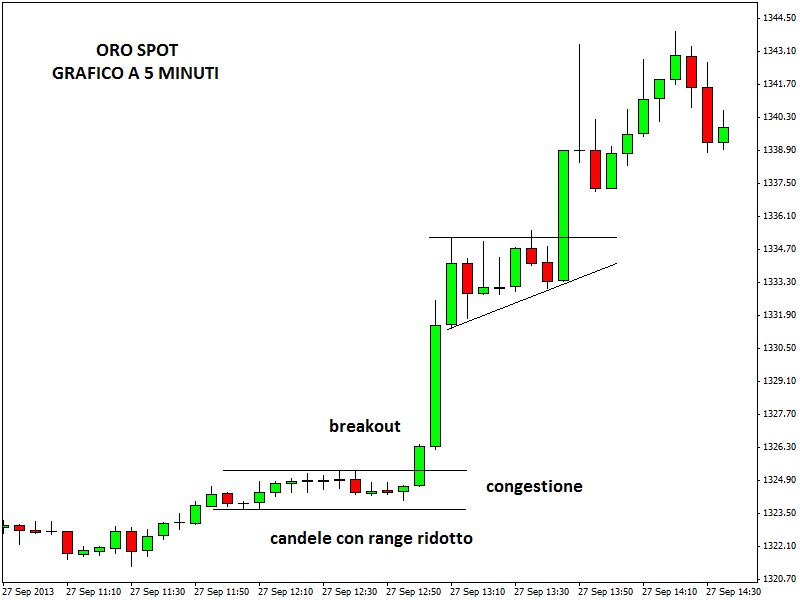 Se osserviamo l’esempio grafico sull’oro spot (ovvero il gold), time frame a 5 minuti, possiamo notare la presenza di una congestione con bassa volatilità. Le candele presentano un range ridotto con un corpo (real body) molto piccolo o addirittura inesistente. Il breakout di questa breve fase laterale è subito convincente e rappresenta una buona opportunità long intraday, da sfruttare nei minuti successivi grazie a un ottimo rapporto rischio/rendimento.