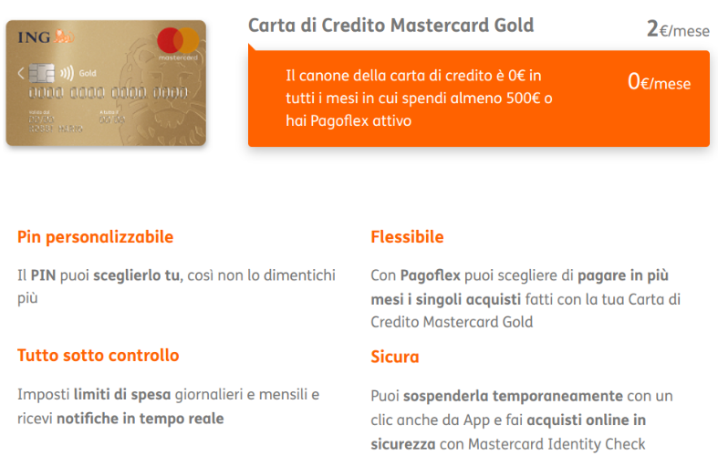 Oltre all’imposta da bollo, un ulteriore costo è rappresentato dal canone mensile della Carta di credito MasterCard Gold, prodotto accessorio al Conto Corrente Arancio che può essere richiesta online insieme alla Carta di debito e alla Carta prepagata virtuale.