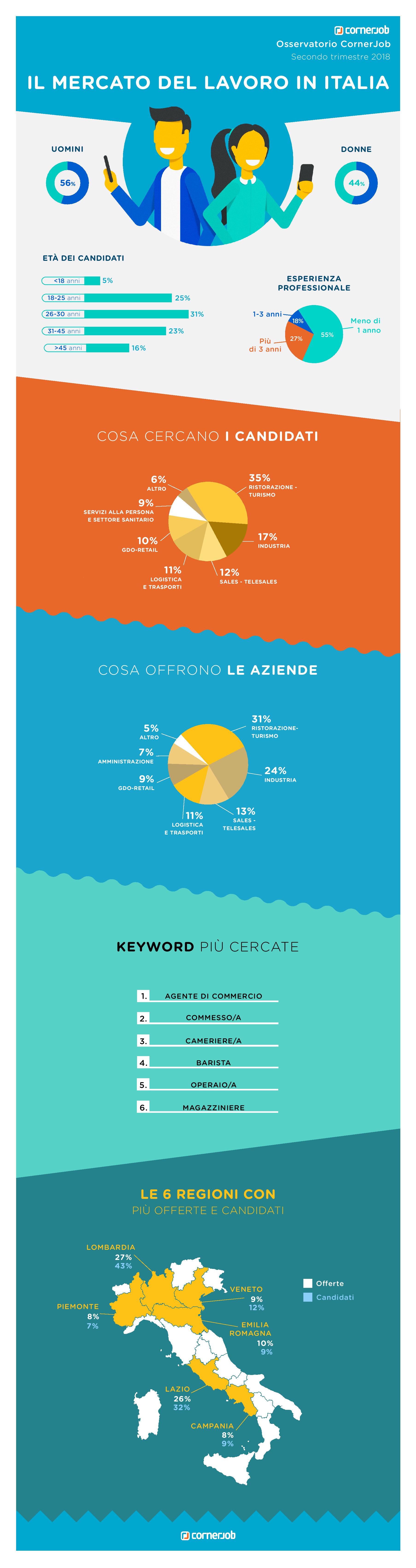 CornerJob è una piattaforma per dispositivi mobili dedicata alla ricerca di lavoro oggi attiva in Italia, Francia, Spagna e Messico e oggi fa un quadro della situazione occupazionale in Italia partendo dai dati rilevati: i risultati forniscono indicazioni su quali siano i settori più fiorenti al momento e quali le regioni dove è maggiore l’offerta e la domanda di lavoro.