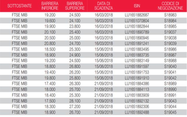Di seguito un esempio sul funzionamento di un Corridor Certificate di Société Générale. Prendiamo in esame il Certificate con sottostante l’indice FTSE Mib e ISIN LU1651883495. Con scadenza il 15 giugno 2018 e ultimo giorno di quotazione il 12 giugno 2018, la Barriera inferiore è posta a 18.500 punti mentre quella inferiore a 25.300 punti. Ai valori attuali del FTSE Mib (23.849,67 punti), la distanza del sottostante dalla Barriera inferiore è del 22,43% e del 6,08% da quella superiore. Il prezzo d’acquisto sul mercato SeDeX del Corridor Certificate è di 6,14 euro (valore al 24 gennaio 2018).