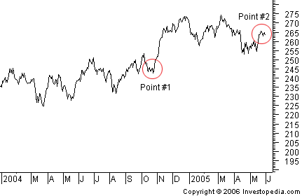 Il grafico sopra è un esempiomolto semplice che rappresenta il movimento dei prezzi di un’azione nell’arco di un anno e mezzo. Sull’asse orizzontale (asse delle x) c’è la variabile temporale. Nell’asse verticale invece (asse delle y) è mostrato il prezzo. Guardando al grafico riconosciamo dunque che al punto 1 il prezzo era circa 245$, mentre del punto 2 il prezzo è aumentato a 265 dollari. Intuitivamente allora possiamo dire che nel periodo tra il punto 1 ed il punto 2, il prezzo del titolo cui fa riferimento il grafico è aumentato.
