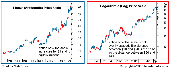 Nella scala logaritmica la distanza tra i punti sarà uguale in termini percentuali. Un movimento da 10 a 20 sarà un aumento del 100%, mentre da 40 a 50 rappresenterà un cambiamento del 25%. In questo caso, il movimento da 10 a 20 sarà rappresentato da uno spazio maggiore sul grafico rispetto a quello occupato dal movimento da 40 a 50 perché inferiore come percentuale.