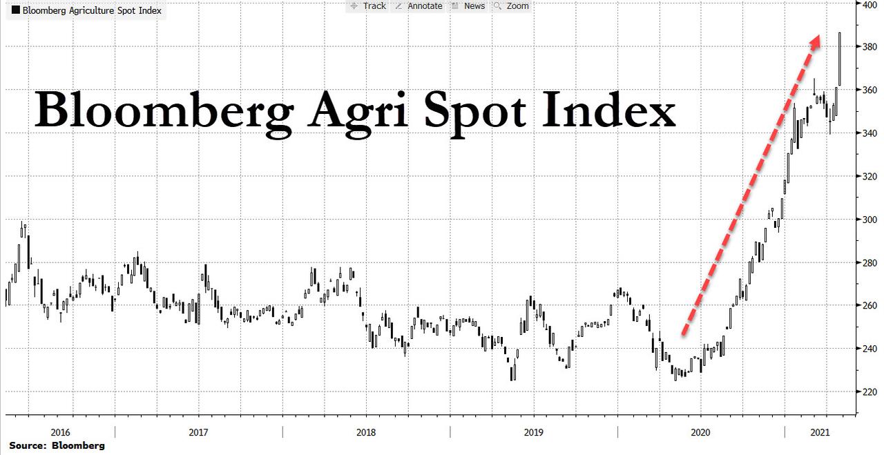 E per non parlare del prezzo dei beni alimentari tracciati dall’Agri Spot Index di Bloomberg e plasticamente descritto in questo grafico: