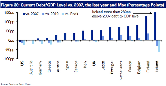 Il grafico si riferisce al rapporto tra PIL e debiti complessivi (governativi, aziendali, finanziari, privati, ovvero delle famiglie) nei Paesi sviluppati. Come abbiamo detto, tale rapporto negli USA si è stabilizzato e, addirittura, grazie al governo, il debito si è ridotto. Almeno così pare.