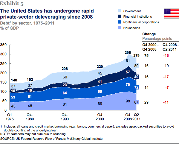 Dal 2008 negli USA, nel settore privato, c’è stato un rapido processo di deleveraging, un fenomeno per cui si riduce la leva finanziaria e il livello di indebitamento.