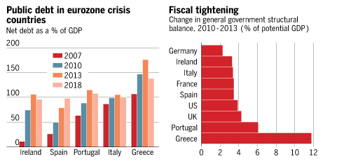 La fiducia dei mercati non è stata ritrovata, il sistema bancario ha perso il 30% dei depositi, l’economia si è ritrovata in una recessione ben più profonda di quatto stimato con un tasso di disoccupazione straordinariamente elevato. Il debito pubblico ha continuato ad essere alto ed ha avuto bisogno di una ristrutturazione, con danni collaterali per i bilanci delle banche già indeboliti dalla recessione andante. La competitività è migliorata leggermente con la riduzione dei salari, ma le riforme strutturali continuano a stagnare e la produttività è ancora sfuggente. Simon Wren-Lewis, Oxford University