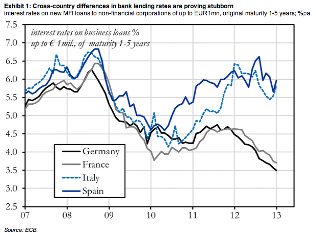 È decisamente nella portata della politica monetaria della BCE farsi carico della pericolosa differenza che c’è tra le condizioni di accesso al credito nelle nazioni ’core’ e in quelle ’periferiche’.
