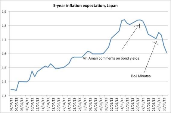 La prima freccia sul grafico fa riferimento ai commenti del Ministro delle Finanze giapponese, in un certo modo preoccupato dell’aumento del rendimento sui titoli nipponici. La stessa preoccupazione ritorna con la seconda freccia, quando le minute della Bank of Japan rivelavano la preoccupazione di alcuni membri riguardo all’aumento dei rendimenti sui titoli.