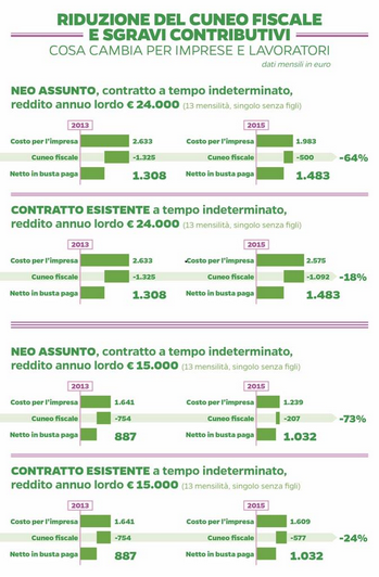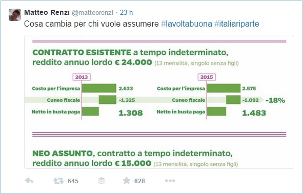 Pubblicato ieri su Twitter un post del premier Matteo Renzi in cui vengono presentati i dati relativi al cuneo fiscale 2015 e agli effetti che avranno su di esso i provvedimenti approvati nella Legge di Stabilità, ovvero il bonus assunzioni per i nuovi contratti a tempo indeterminato stipulati con il contratto a tutele crescenti e gli sgravi sull’IRAP previsti per i neoassunti.