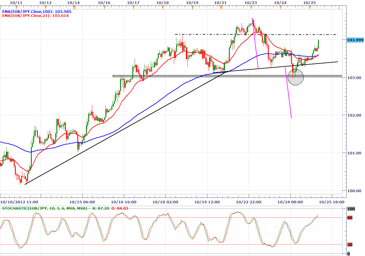 Bella rottura ribassista di breve periodo avvenuta su questo cambio, che è andato a negare l’anticipazione di un potenziale testa e spalle di medio periodo ribassista, individuato sul nostro forum di analisi ieri, dopo la prima rottura. Il fatto che il mercato non abbia superato il livello di 103.00 a ribasso ha permesso di evitare false rotture della neckline leggermente inclinata a rialzo tracciabile su un grafico orario (questo testimonia la grande importanza dei punti statici di mercato nel momento in cui dobbiamo valutare rotture di livelli dinamici che passano relativamente vicini ai più importanti cugini), ed ora ci troviamo al test di di 104.15, massimo della prima ipotetica spalle (ancora valida, quella tracciata tra il 17 ed il 22 di ottobre). Se lo superiamo saliamo verso i massimi e potremmo attenderci tentativi di rottura verso il 105.00, altrimenti potremmo rivedere area 103.35.