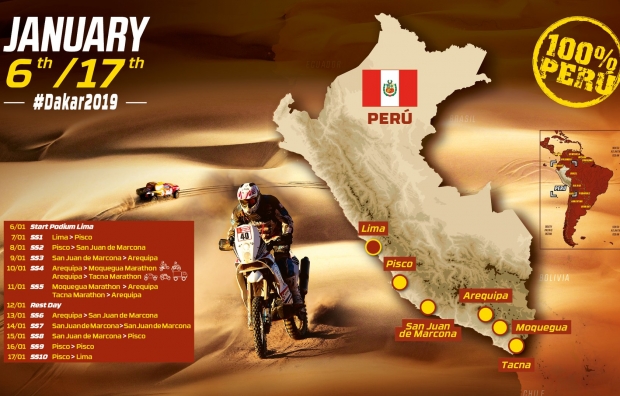 La prima prova è lunga 247 chilometri di cui 84 sono di prove speciali. Si parte da Lima e si va verso Sud, dove si svolgeranno tutte le tappe prima del ritorno nella Capitale.