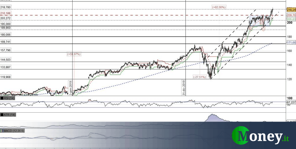 Il titolo rompe a rialzo il massimo della barra del 1 ottobre 2020 a quota 218,68$ per poi riassorbire il livello e chiudere in area 218,24$ formando una barra di indecisione a range ristretto.