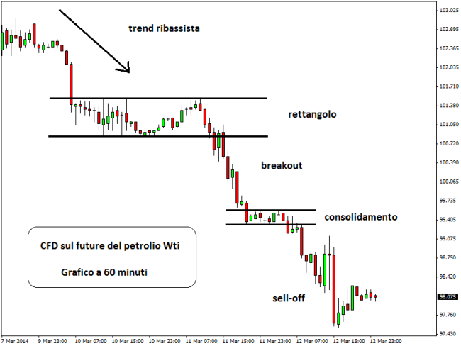 Se il trend principale è ribassista, il trader dovrà ricercare un ingresso sul mercato short sul breakout del supporto identificato dal rettangolo. Per la versione rialzista vale chiaramente l’opposto (breakout della resistenza segnalata dal rettangolo). Allo scopo di comprendere meglio questi concetti, possiamo aiutarci con il grafico a 60 minuti mostrato in alto sul CFD relativo al future sul petrolio Wti. In questo caso può essere eseguita un’operatività di day trading, ma il pattern funziona bene su qualsiasi time frame.