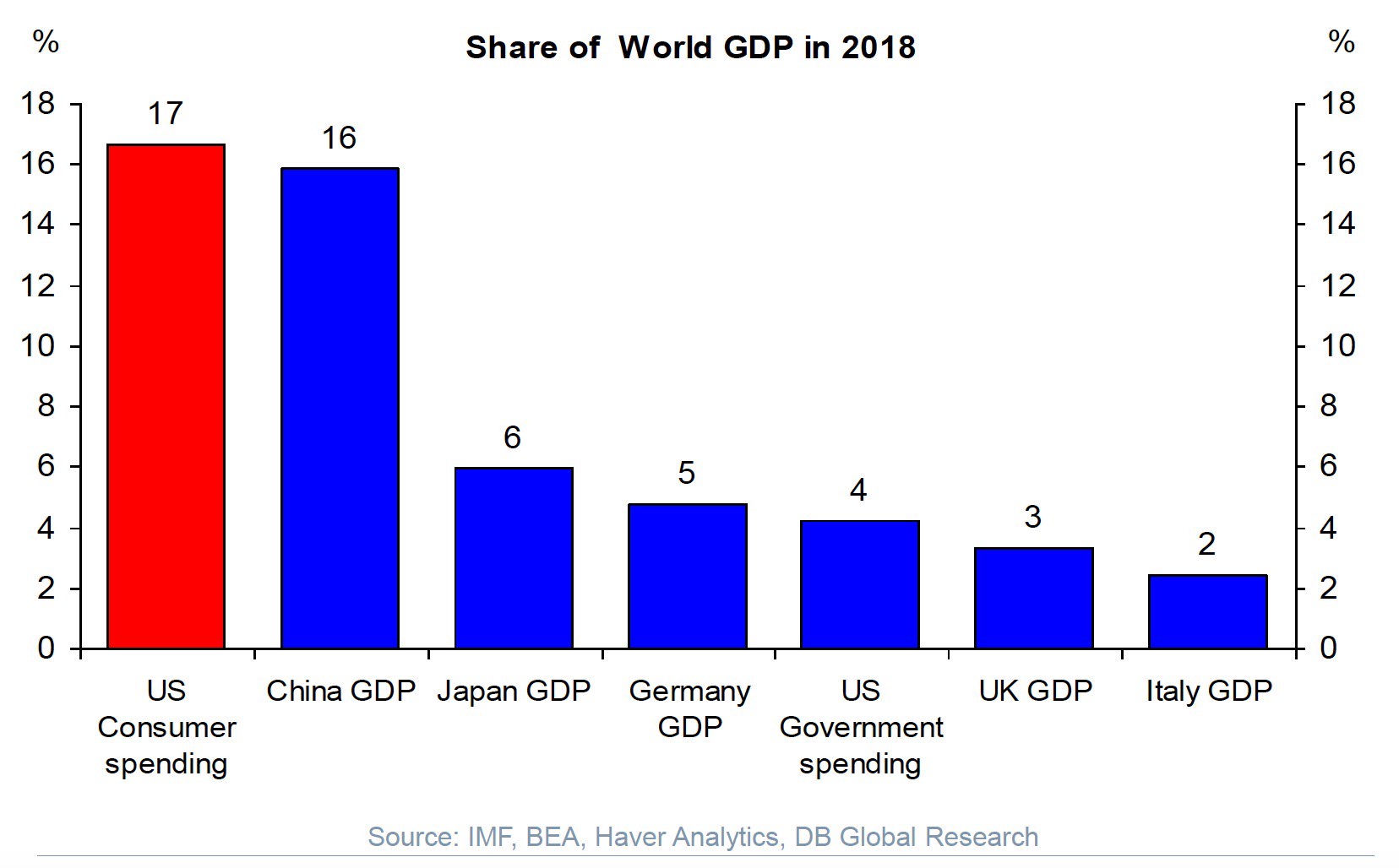 sintetizza silenziosamente la ragione per cui la Fed e il Tesoro dovranno giocoforza trovare ed estrarre dal cilindro l’ennesimo coniglio per irretire i mercati. In un’economia ancora basata al 70% sui consumi personali e che vede quella voce come prima componente del Pil mondiale pre-pandemia, tutto ci si può permettere tranne che il combinato di inflazione fuori controllo e termine di una politica di sostegno reddituale che rasenta in molti aspetti il prodromo dell’helicopter money.