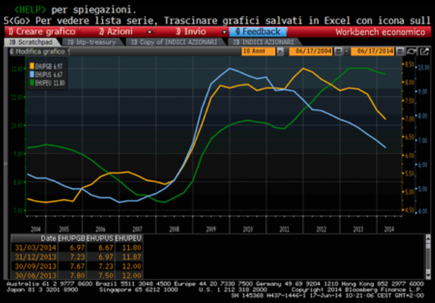Nell’immagine: Andamento del Tasso di Disoccupazione in UK (arancione) , USA (blu) ed Eurozona (verde) dal 2004 ad oggi