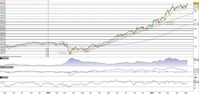 Il titolo continua la corsa e registra il nuovo massimo a quota 394,22$. La rottura della resistenza porta il prezzo verso nuovi obiettivi rialzisti. Studiamo il contesto e l’impostazione tecnica di breve periodo.