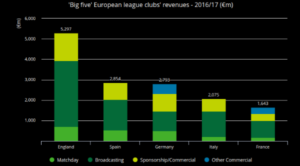 A fare la parte del leone è naturalmente la Premier League, con un fatturato complessivo per quanto riguarda la stagione 2016/2017 che è stato pari a 5,3 miliardi. Un risultato migliore in confronto al passato grazie soprattutto al nuovo accordo per i diritti televisivi.