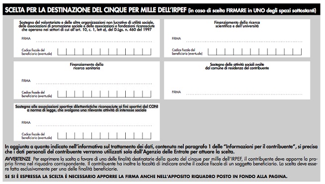 Nel modello 730 ordinario od Unico 2015 sono già presenti gli spazi relativi alla destinazione del 5 per mille. Basterà indicare il codice fiscale del beneficiario e firmare.