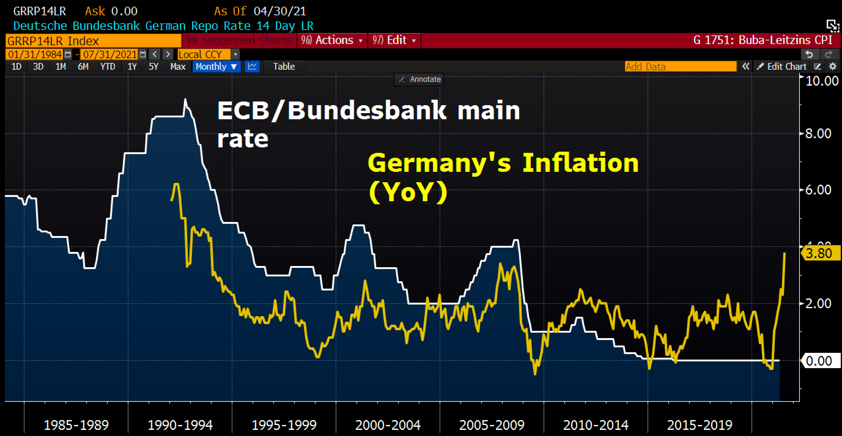 a mostrare il risvolto sistemico della decisione: nel giorno in cui il Pil tedesco segnava nel secondo trimestre un +1,5% contro le attese del +2%, sintomo di un’incidenza decisamente pesante dei colli di bottiglia nella supply chain industriale, ecco che il dato dell’inflazione di luglio parlava di un +3,8% contro le attese del +3,2%, la lettura più alta dal boom inflazionistico post-riunificazione nel 1993. E non basta, perché il secondo grafico appare ancora più chiaro: la legacy della Bundesbank pare decisamente a rischio a livello di peso nelle decisioni della Bce, poiché l’ultima volta in cui il Cpi tedesco aveva raggiunto questo livello, il tasso di interesse era al 6%. Oggi è a 0%. E destinato a restarci per l’eternità.