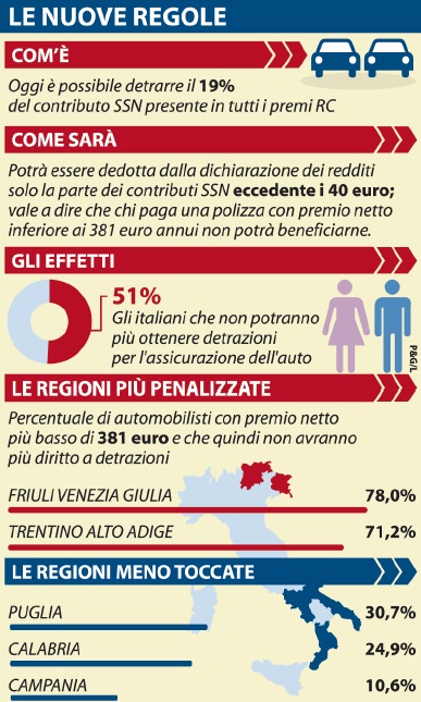 Circa il 51% degli automobilisti si vedrà negato il diritto alla detrazione. Secondo i dati le regioni più colpite da Nord a Sud saranno: Friuli Venezia Giulia, Trentino Alto Adige, Campania, Calabria e Puglia.