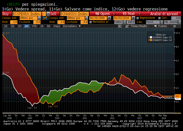 In maggio l’inflazione della zona euro torna dunque sul livello già visto lo scorso marzo, il più basso dal novembre del 2009. In assenza di interventi decisivi della BCE dunque il trend deflattivo potrebbe innescarsi, visto che ad aprile persino la massa monetaria M3 era salita ad un ritmo ben inferiore alle aspettative: +0.8% su base annua contro un + 1.2% atteso dagli analisti. Il dato sulla crescita asfittica della massa monetaria segnala infatti una bassa velocità di circolazione della moneta e quindi uno scarso aumento degli impieghi delle banche all’economia reale. Il basso costo delle materie prime ed energetiche quindi non basta più a spiegare la quasi assenza del fenomeno inflattivo in eurozona, come più volte ha tentato di argomentare lo stesso Draghi per scongiurare lo spettro della deflazione.