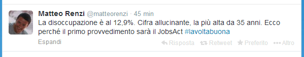 Il Premier, attraverso un tweet pubblicato quasi un’ora fa, promette agli italiani di intervenire immediatamente, attraverso il Job Acts, provvedimento che, insieme alla riduzione del cuneo fiscale, dovrebbe servire a riformare e a far ripartire il mercato del lavoro italiano.