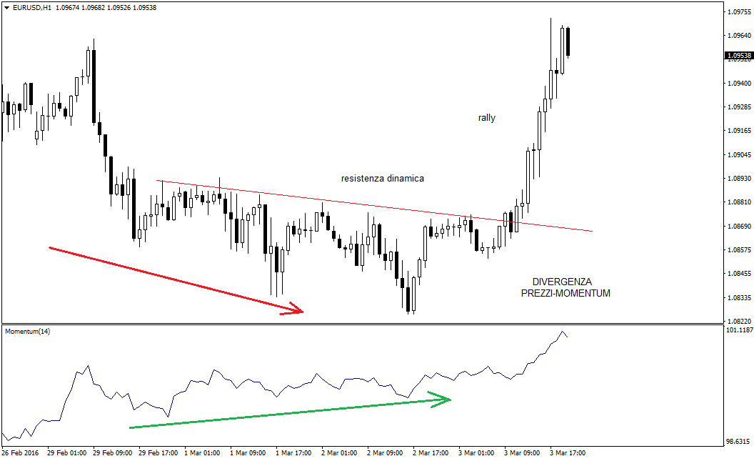 Una situazioe di questo tipo di mettere in allerta il trader, in vista di una possibile inversione del trend. E’ ciò che è successo, ad esempio, al tasso di cambio Euro/Dollaro, analizzato con il grafico intraday a 60 minuti in alto. Il cambio EUR/USD evidenzia minimi decrescenti, mentre l’oscillatore mostra minimi crescenti. Dopo una fase lateral-ribassista con bassa volatilità, avviene un boom dei prezzi che segnala l’inversione al rialzo della tendenza di breve periodo.