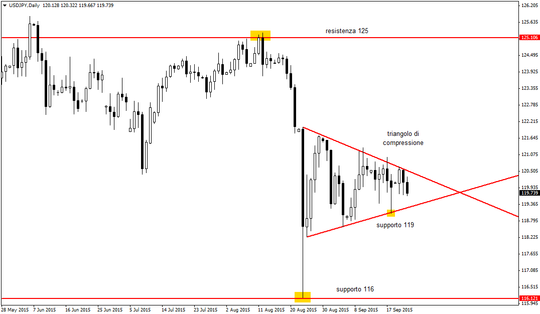 Di converso se il breakout avverrà al ribasso, precisamente a seguito della perdita del supporto chiave di area 119 – 118,5, il cambio USD/JPY dovrebbe accelerare bruscamente mostrando un sell-off con primo target di prezzo posto sui minimi di fine agosto scorso in area 116. Qui, e fino a 115,5, è presente un maxi-supporto di medio periodo che, se rotto con decisione al ribasso, dovrebbe spingere i prezzi fino al supporto successivo di area 110. Quest’ultimo scenario, estremamente ribassista per il cambio, presuppone anche la caduta delle borse e una forte avversione al rischio da parte degli investitori.