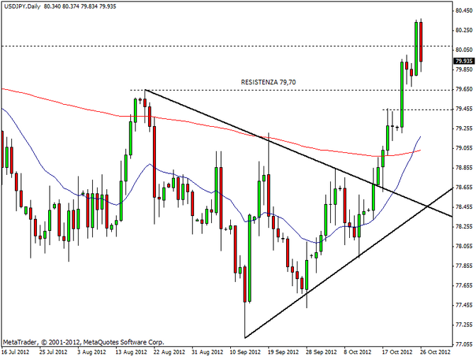 Possibile inversione del trend sul tasso di cambio dollaro/yen, che stamattina aveva toccato il massimo più alto degli ultimi 4 mesi a 80,37. Con l’apertura delle borse europee c’è stato un forte apprezzamento della divisa nipponica e il cambio è sceso sotto 80. Ora, in caso di chiusura sotto 79,80, potrebbe esserci l’inversione del trend i breve periodo con ritorno a 79 prima e 78,50 poi.