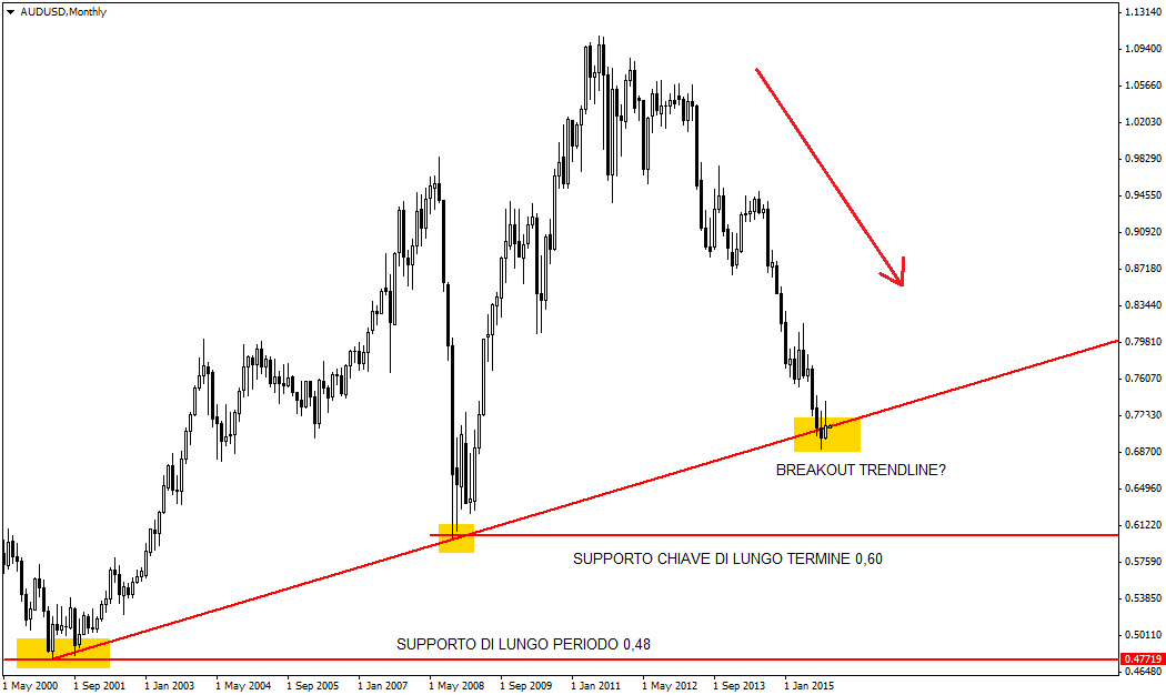 Se i fondamentali macroeconomici non sorridono alla valuta oceanica, nemmeno l’analisi tecnica sembra venire in soccorso all’ormai ex asset rifugio. Infatti, se si osserva il grafico mensile del tasso di cambio AUD/USD, si può notare che i prezzi sono a un passo dal breakout ribassista di una trendline di lungo termine. Se la rottura dovesse concretizzarsi nei prossimi giorni, l’Aussie potrebbe crollare pericolosamente fino ad avvicinarsi al supporto chiave di 0,60, che corrisponde ai bottom di oltre 5 anni fa. Un calo del genere dai valori correnti equivarrebbe a un deprezzamento shock del 20%. Negli ultimi 4 anni l’Aussie si è già svalutato quasi del 50%.