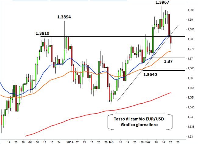Sul forex il dollaro americano sta beneficiando della rivisitazione della forward guidance della FED e delle prospettive di costante riduzione degli stimoli monetari, ora ridotti a 55 miliardi di dollari al mese. Il tasso di cambio EUR/USD, che sembrava ormai in procinto di effettuare il breakout di 1,40, ha sperimentato una forte correzione. Ieri i prezzi sono scesi sui minimi a due settimane circa in area 1,3750. La presenza della EMA50, che funge da supporto dinamico al trend rialzista di medio periodo, potrebbe però favorire un rimbalzo tecnico. Tuttavia il biglietto verde sta beneficiando dell’aumento di posizioni long di breve periodo, anche a seguito della pubblicazione di alcuni market mover positivi, come quelli di ieri (Philly FED e Leading Indicator).