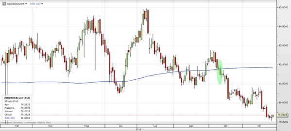 Lo scorso 11 settembre, sul grafico daily dell’indice del Dollaro USA (USDX) si è verificata la rottura ribassista della media mobile semplice a 200 giorni e da allora, l’indice continua sulla via del ribasso.