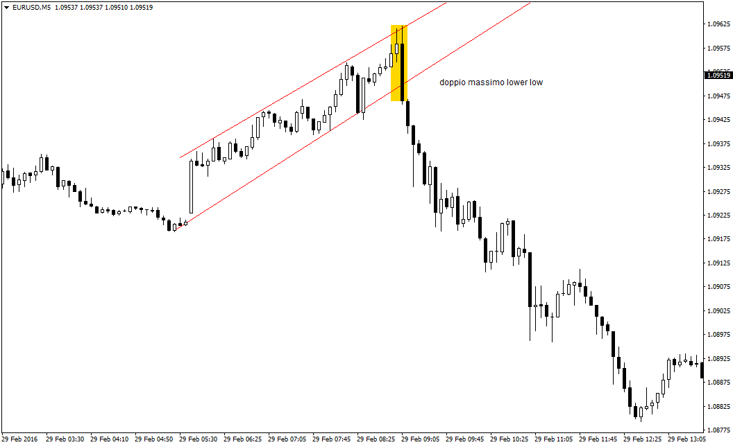 Alcuni pattern di inversione hanno grosse chance di identificare un’area di massimo o minimo del mercato, anche solamente nel breve-medio termine. Uno di questi è senza dubbio il doppio massimo lower low. Si tratta di un setup a due candele, caratterizzato tra l’altro dalla presenza di un tweezer top, ovvero di un doppio massimo ravvicinato tra le due candele che compongono il pattern. L’altra caratteristica fondamentale è che la seconda candela è una long candle molto ribassista.