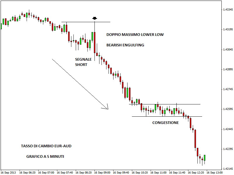 Se si osserva il chart a 5 minuti del tasso di cambio EUR-AUD, ovvero euro su dollaro australiano, si può notare la comparsa di un bellissimo doppio massimo lower low che in questo caso è anche un bearish engulfing. Il segnale di inversione del trend è molto forte, rafforzato anche dal fatto che si tratta della stessa tendenza evidenziata su base daily nel breve periodo. A fronte di un rischio limitato, era possibile ottenere un guadagno davvero eccezionale nel corso della giornata.