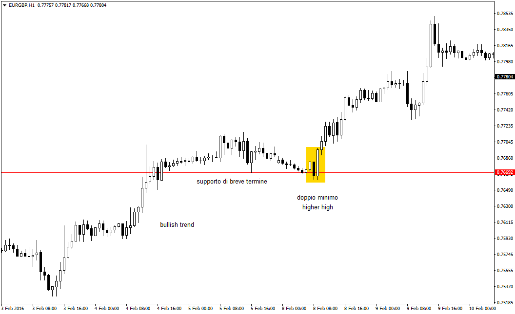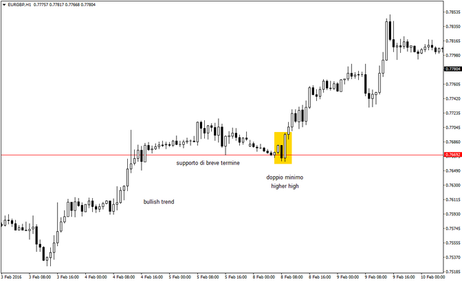 Oggi ci occupiamo di un reversal pattern, che può fornire ottime indicazioni operative al trader anche quando si appresta a lavorare trend molto direzionali. Grazie ai pattern di inversione si può anche identificare il miglior momento di entrata sul mercato, a seguito di una fisiologica correzione lungo un solido trend direzionale. Il pattern che esaminiamo è il doppio minimo higher high. E’ un pattern a due candele: la prima è negativa, la seconda è positiva con un corpo che chiude ben al di sopra del massimo della candela precedente.
