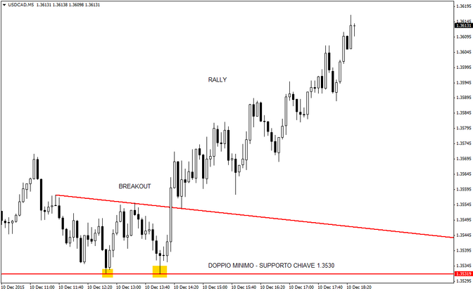 Il grafico in alto è relativo al tasso di cambio USD/CAD, time frame intraday a 5 minuti, interessato da un doppio minimo con successivo breakout rialzista della zona di resistenza di breve termine. Il Loonie viene così fuori da una fase laterale piuttosto prolungata e può ambire rapidamente a nuovi top intraday. Nel giro di poche ore questo cambio riesce a guadagnare circa 70-80 pip.