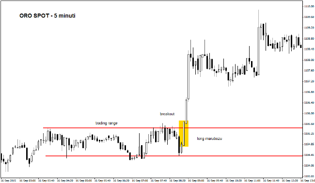 Nell’esempio mostrato in alto sul grafico a 5 minuti dell’oro spot, si può notare una stretta fase di congestione dei prezzi. La comparsa di una long marubozu rialzista è un segnale molto preciso di una imminente accelerazione del trend verso l’alto. Tra l’altro questa candela riesce anche ad effettuare il breakout rialzista della congestione: è un segnale long intraday da cogliere al volo. Nei minuti successivi il gold mostrerà un interessante rally.