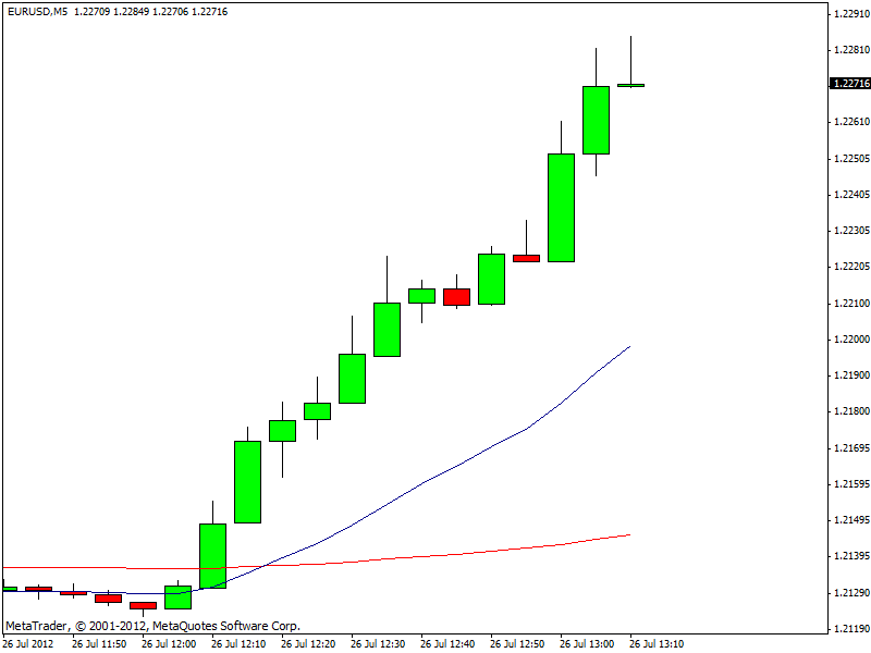 Sul Forex il tasso di cambio euro/dollaro ha messo il turbo ed è salito fino a 1,2287, dopo aver toccato un minimo intraday a 1,2117. In forte rialzo anche euro/yen, che sale sopra 96. Le parole di Draghi hanno cambiato il mood degli investitori e da circa un’ora è partito l’acquisto di asset più rischiosi. Vola anche l’oro in area 1.620$ l’oncia.