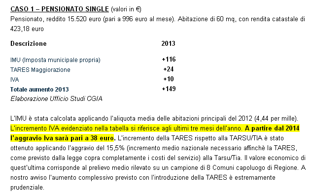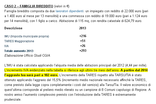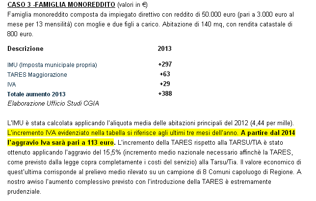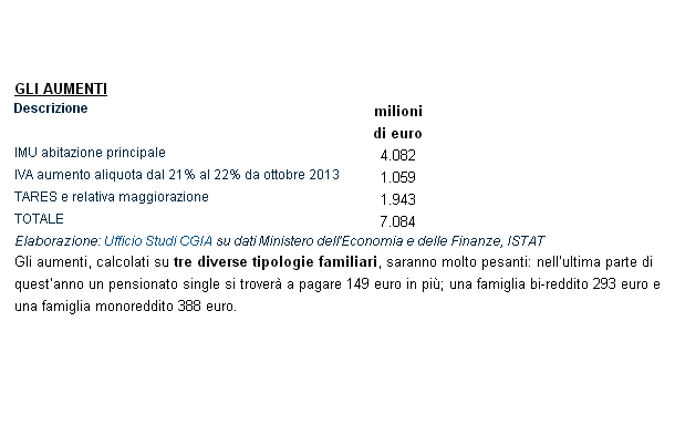 La Cgia di Mestre sostiene che la stangata sui contribuenti italiani nel caso il governo Letta fallisse oscillerebbe tra i 149 e i 388 euro, più precisamente: