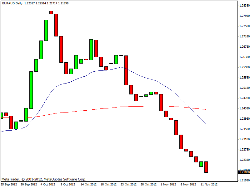 Il tasso di cambio euro - dollaro australiano (EUR/AUD) è sceso oggi sui minimi più bassi da oltre due mesi a 1,2171. Con l’inizio del mese di novembre il trend ribassista del cambio sta diventando sempre più solido. Il dollaro australiano è in forte rialzo contro l’euro grazie alla decisione della RBA di non tagliare ulteriormente i tassi. Lo scorso 5 ottobre il cambio quotava a 1,2820, oggi è sotto 1,22. In poco più di un mese il cambio EUR/AUD è sceso del 5%.