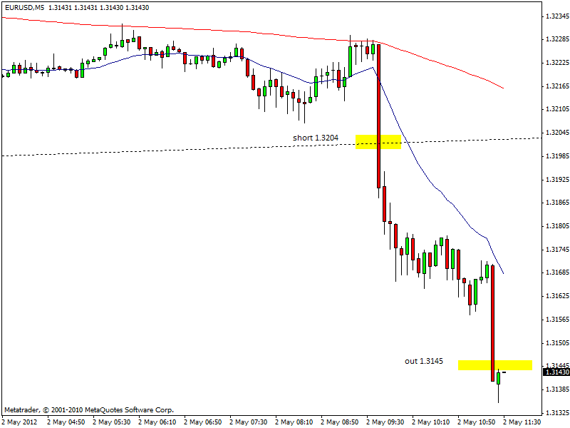 Stamattina avevo suggerito uno short intraday sul tasso di cambio EUR/USD da 1.32. In realtà, con il crollo in corso dopo il dato sull’indice PMI manifatturiero in Europa ho anticipato di qualche pip a 1.3204. Lo stop loss iniziale era, come detto nel report di questa mattina, posto a 1.3235. La discesa è stata molto intensa e ha raggiunto l’area di target di 1.3150. Sono uscito at market a 1.3145, forse sbagliando perché il trend ribassista sembra molto potente. Ad ogni modo metto in cassa 59 pip.
